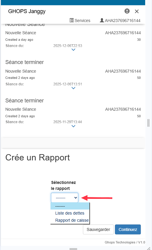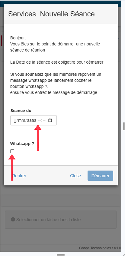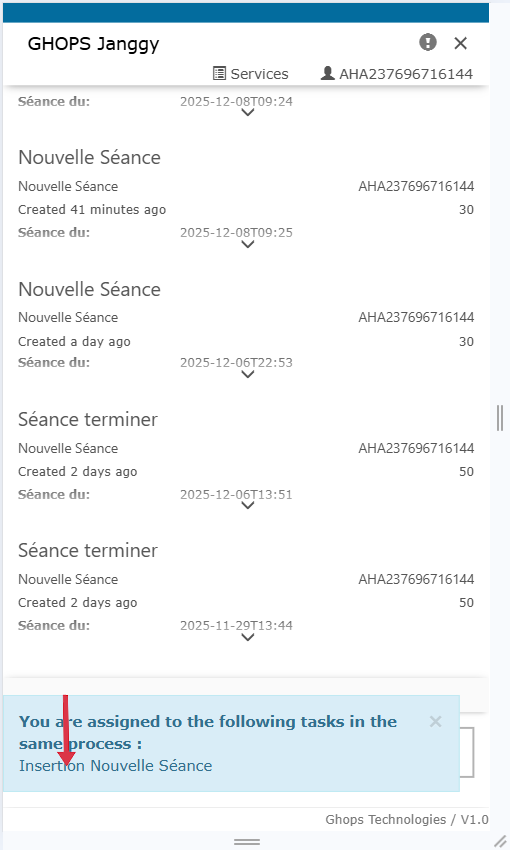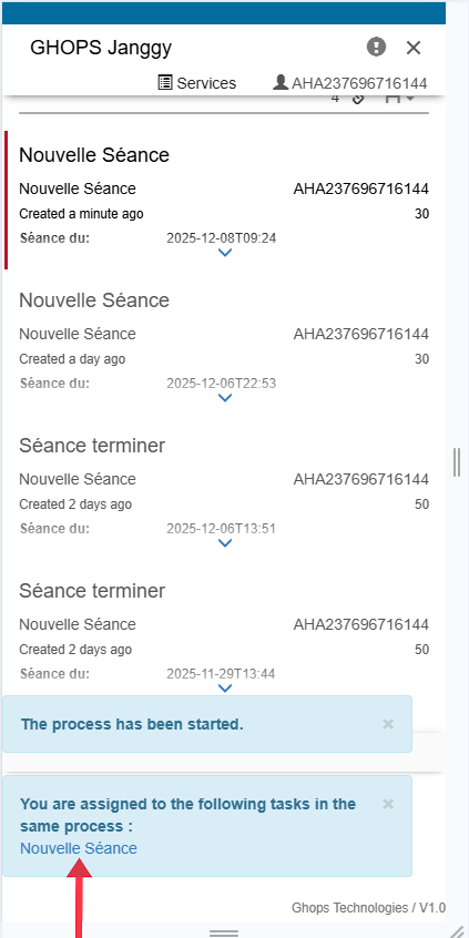 apres avoir cliquez sur le message une nouvelle page va s'afficher avec les informations de la séance que vous avez déja remplis descendez tout en bas et mettez le boutton valider à oui, appuyez sur continuer pour enregistrer et terminer votre séance