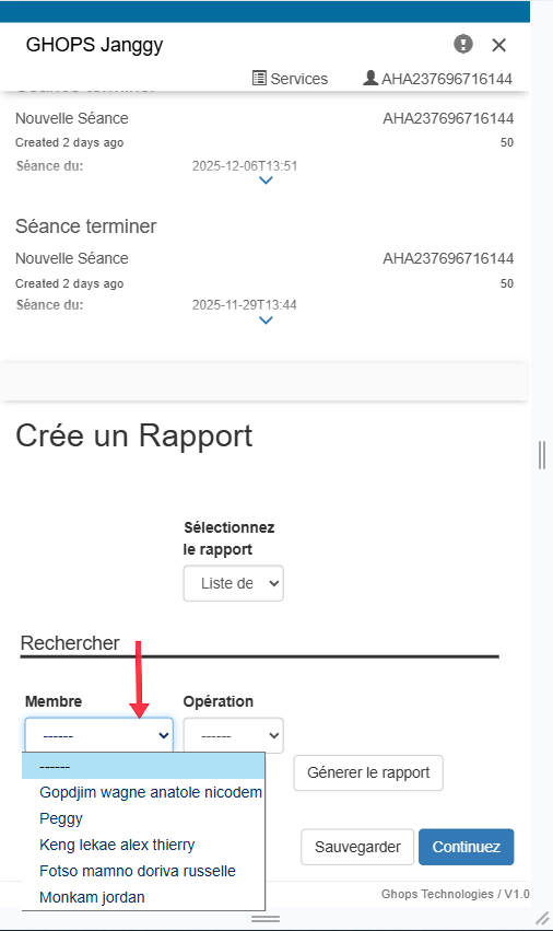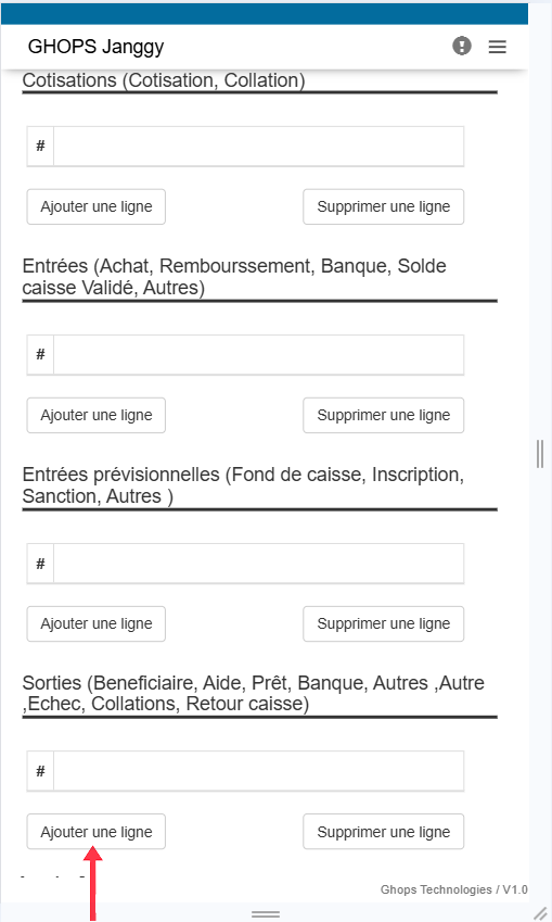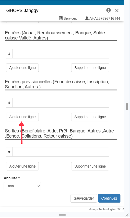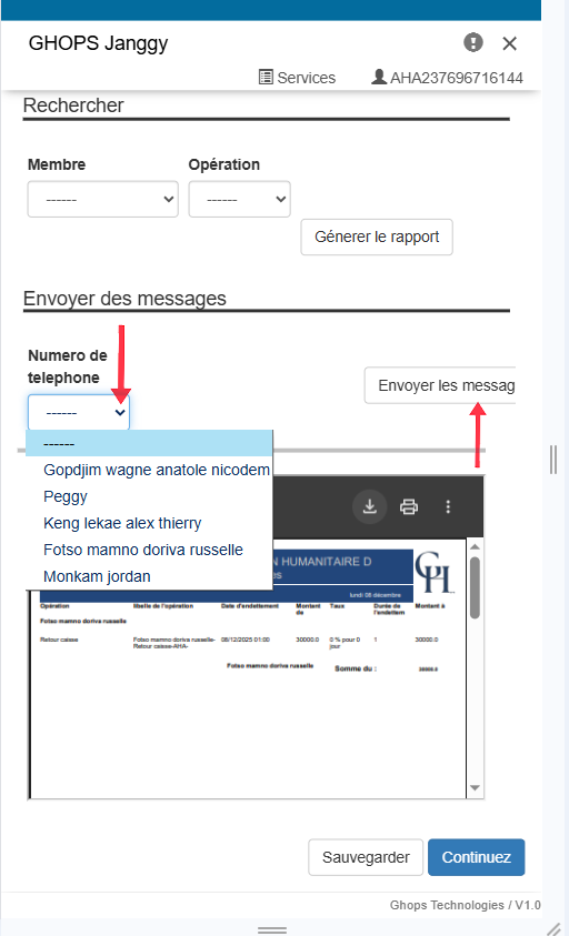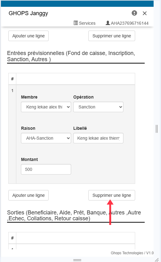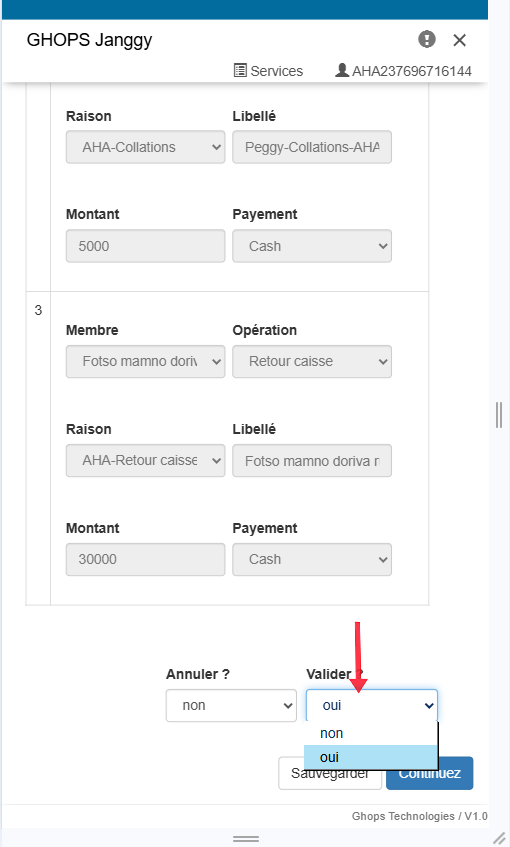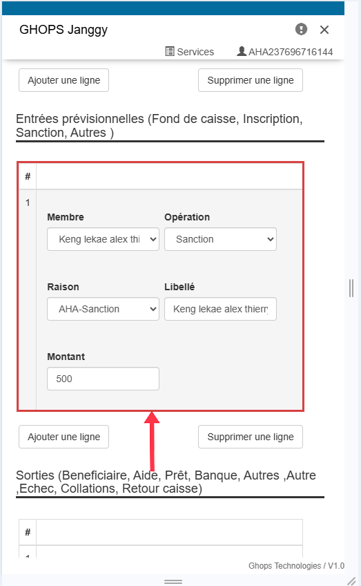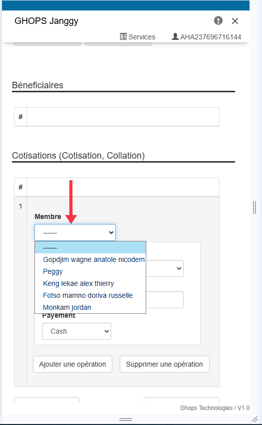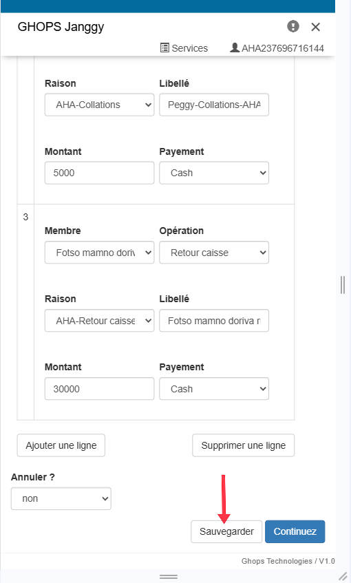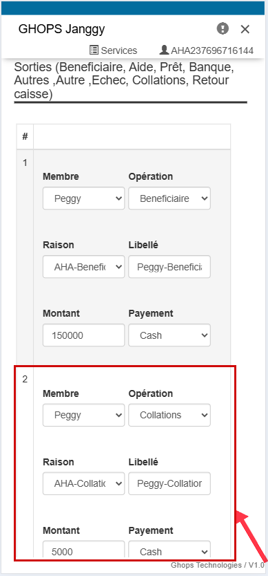 Remplissez tous les champs qui apparaissent (membre, operateur, raison, libelle, montant) Nb: au niveau du libellé vous pouvez vous meme ecrire le libellé de votre choix par exemple : sortir pour l'aide maladie de Mr .....
