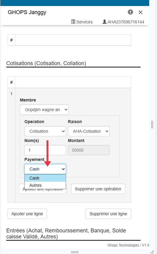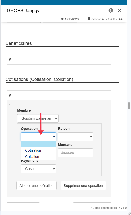 selectionnez l'operation effectuer par le membre (cotisation,collation, autres...)